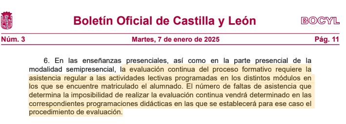 En las enseñanzas presenciales, así como en la parte presencial de la modalidad semipresencial, la evaluación continua del proceso formativo requiere la asistencia regular a las actividades lectivas programadas en los distintos módulos en los que se encuentre matriculado el alumnado. El número de faltas de asistencia que determina la imposibilidad de realizar la evaluación continua vendrá determinado en las correspondientes programaciones didácticas en las que se establecerá para ese caso el procedimiento de evaluación.
